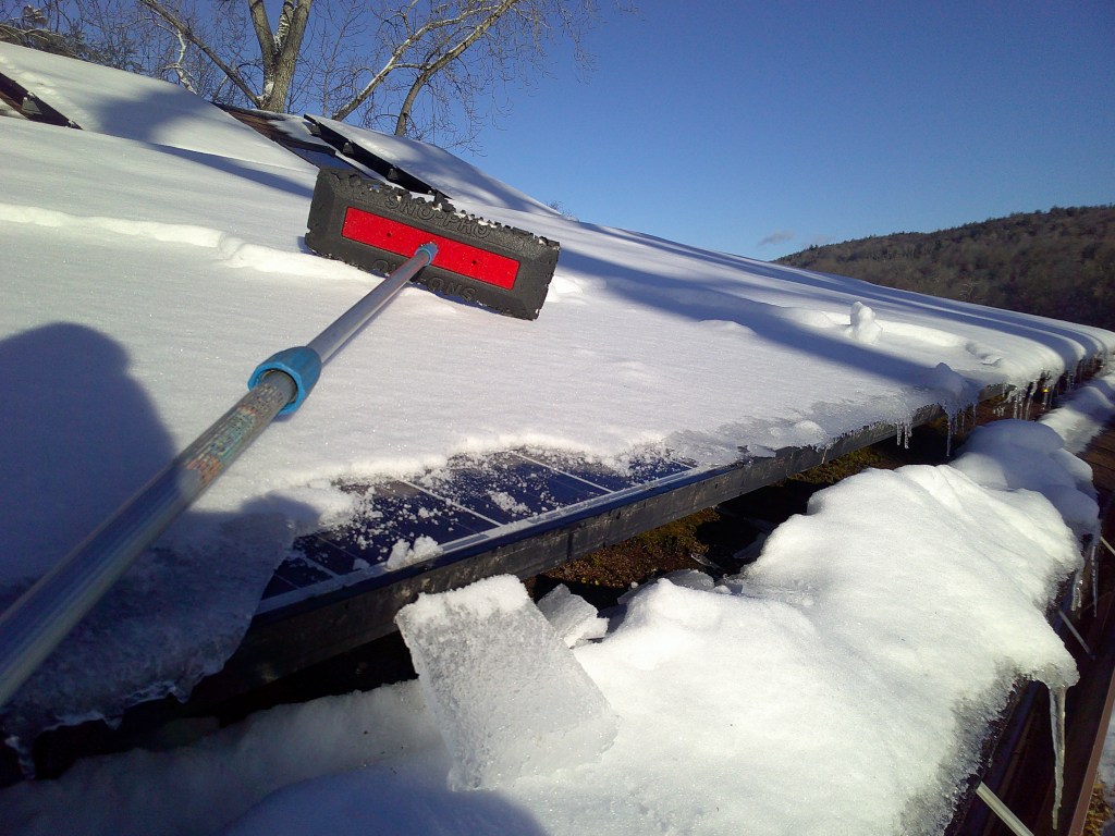 This photo shows how our rooftop array of solar panels was recently covered by a dusting of snow, leaving it temporarily unable to generate any electricity. However, there was one crack along the lower edge that showed through to the underlying panel, and when I knocked away a few more square inches of icy snow with my rubberized panel brush, the sunlight was able to start doing its work – first warming up the exposed dark panels and melting away the adjacent snow covering until, inch by inch, each panel will again be exposed to direct sunlight so that the entire roof-top array can be firing away on all cylinders. It’s a slow process, but one that’s as inevitable as the seasons.